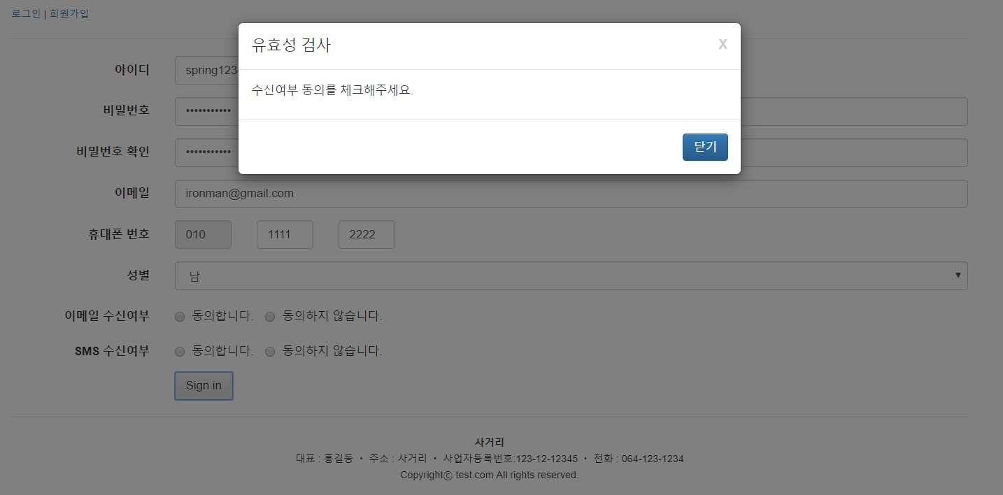 이번시간에는 휴대폰 번호, 성별, 이메일 수신여부, SMS 수신여부 유효성 검사를 진행할 것이다.
