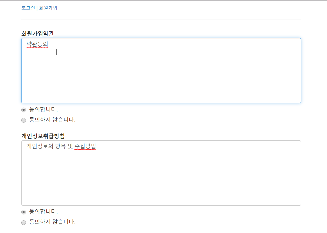 head 태그를 위와 같이 셋팅한 후 화면을 다시 띄워보면 다음과 같이 나오는데 회원가입약관, 개인정보취급방침에 해당하는 textarea는 현재 필요하지 않아서 뺐다.